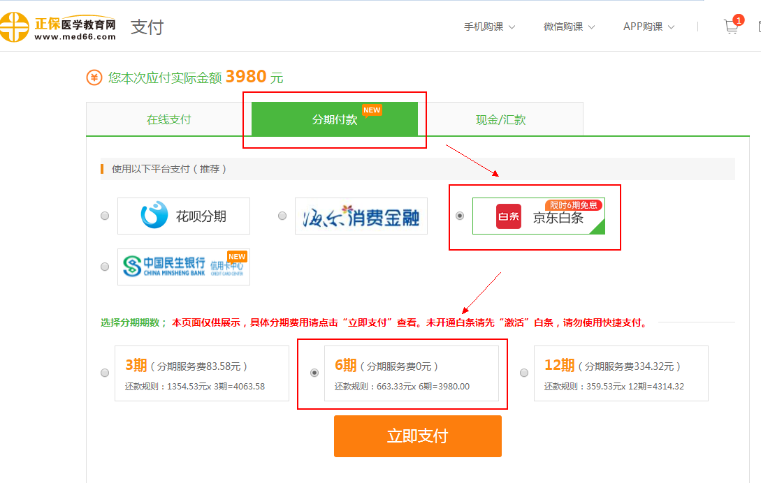 第四步:在支付頁(yè)面,選擇分期付款-京東白條進(jìn)行支付,分期期數(shù)一定要選擇6期哦!操作非常簡(jiǎn)單喲~速來(lái)購(gòu)課吧!