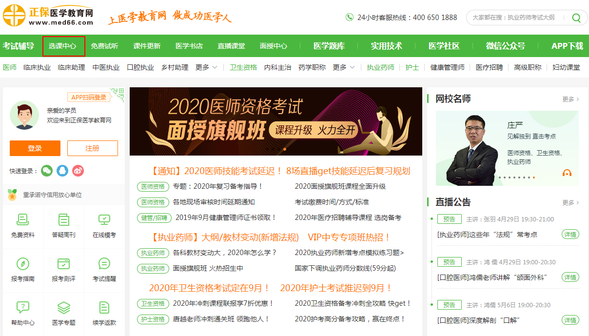第一步:在醫(yī)學教育網(wǎng)首頁點擊“選課中心”按鈕;