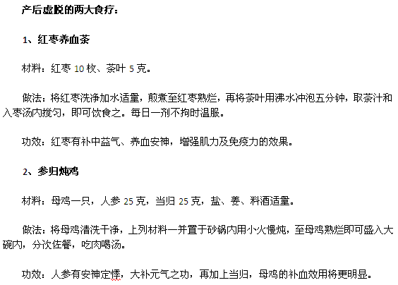 因?yàn)楫a(chǎn)婦在生產(chǎn)過程中,能量消耗又未能及時(shí)補(bǔ)充,在產(chǎn)后容易導(dǎo)致產(chǎn)后虛脫。產(chǎn)后虛脫即產(chǎn)后產(chǎn)婦出現(xiàn)面色蒼白、周身出汗、四肢發(fā)冷,主訴頭暈、乏力、有的出現(xiàn)惡心嘔吐,甚者出現(xiàn)暈厥。產(chǎn)后虛脫常常見于產(chǎn)婦產(chǎn)后第1次下床活動或上廁所時(shí)。產(chǎn)婦很容易有產(chǎn)后虛脫,產(chǎn)婦一旦有產(chǎn)后虛脫,將會導(dǎo)致產(chǎn)婦的抵抗力低下,甚至影響產(chǎn)婦的身體健康,所以產(chǎn)婦要及時(shí)治療產(chǎn)后虛脫。下面為大家介紹下產(chǎn)后虛脫的兩大食療。