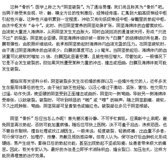 在現(xiàn)實生活中,有些人把陰莖看成是一根會變化的“骨頭”:有時變軟,有時變硬。其實,它是由一對陰莖海綿體和一根尿道海綿體所組成的器官。那么,陰莖為什么會發(fā)生“骨折”呢?