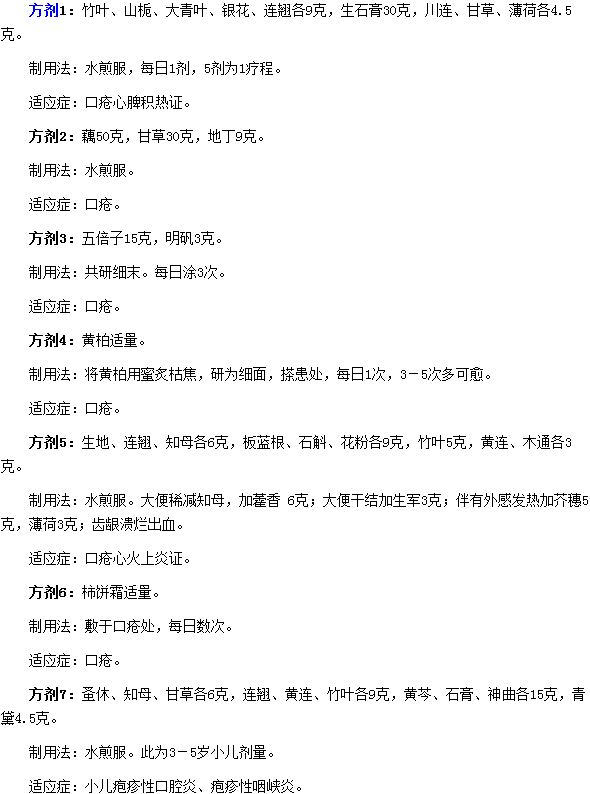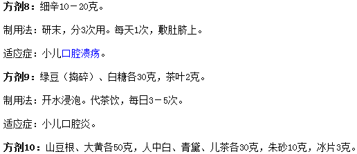 制用法:共研為細粉,儲瓶高壓消毒。用時以3%硼酸溶液清潔口腔,取 2%甲紫溶液調上藥呈糊狀,每日 3-5次涂搽。