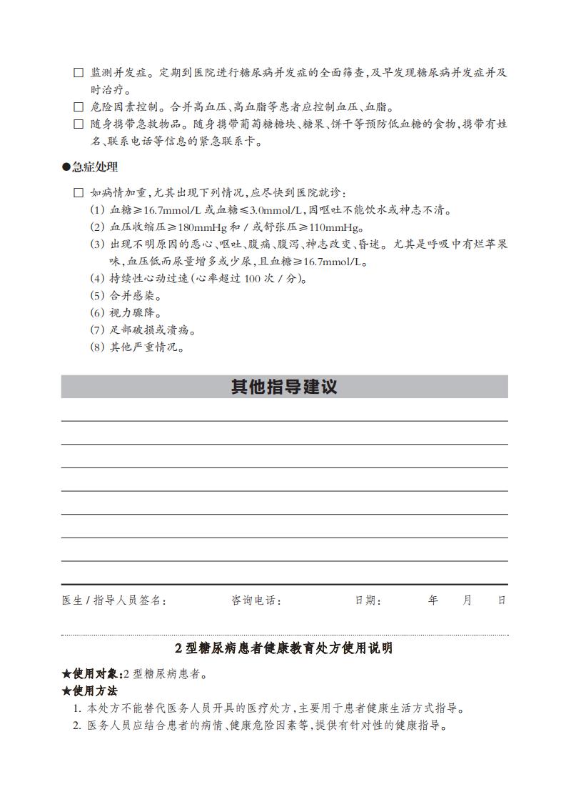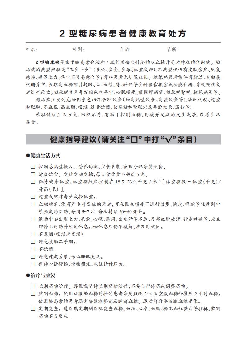 2型糖尿病是由于胰島素分泌和 / 或作用缺陷引起的以血糖升高為特征的代謝病。糖 尿病的典型癥狀是“三多一少”(多飲、多食、多尿、體重減輕),不典型癥狀有皮膚瘙癢、反復(fù) 感染、疲倦乏力、傷口不容易愈合等;有些患者無明顯癥狀。糖尿病患者常伴有脂肪、蛋白質(zhì) 代謝異常,長期高血糖可引起眼、心、血管、腎、神經(jīng)等多種器官損害或功能衰竭,導(dǎo)致殘疾或 者過早死亡。糖尿病常見并發(fā)癥包括卒中、心肌梗死、視網(wǎng)膜病變、糖尿病腎病、糖尿病足等。 糖尿病主要的危險(xiǎn)因素包括不合理飲食(如高熱量飲食、高鹽飲食等)、缺乏運(yùn)動(dòng)、超重 和肥胖、高血壓、高血脂、吸煙、過量飲酒、長期精神緊張以及年齡增長、遺傳等。 采取健康生活方式,積極治療,有助于控制血糖,延緩并發(fā)癥的發(fā)生發(fā)展,改善生活 質(zhì)量。