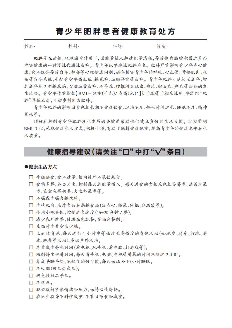 肥胖是在遺傳、環(huán)境因素作用下,因能量攝入超過能量消耗,導(dǎo)致體內(nèi)脂肪積累過多而危害健康的一種慢性代謝性疾病。青少年以單純性肥胖為主。肥胖嚴(yán)重影響青少年身心健 康,它不僅會導(dǎo)致自卑、抑郁等心理健康問題,還會損害青少年的呼吸、心血管、骨骼肌肉、生殖等各個(gè)系統(tǒng),引起青少年高血壓、糖尿病、血脂異常等疾病。青少年肥胖可延續(xù)至成年,增 加成年期2型糖尿病、心腦血管疾病、不孕癥、腰椎間盤脫出、痛風(fēng)、膽石癥、癌癥等疾病的發(fā)生風(fēng)險(xiǎn)。