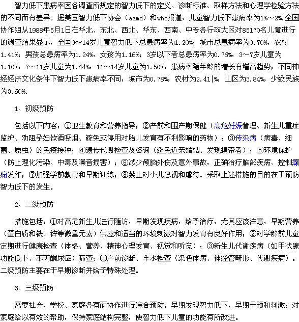通過對上文的了解,相信廣大家長朋友們已經(jīng)知道了智力低下的三級預(yù)防方法是什么了,預(yù)防的根本途徑是不斷加深對智力低下病因?qū)W的研究,只有針對病因采取措施,才能使預(yù)防更加有效,希望上述文章對大家能夠有所幫助。
