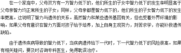 關(guān)于父母智力低下會不會遺傳給孩子的相關(guān)內(nèi)容,通過小編對上文的介紹,相信大家已經(jīng)有所了解了,希望上述文章對大家能夠有所幫助。