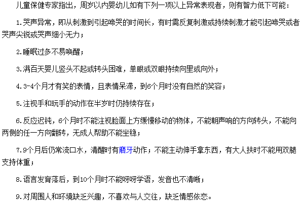 您想知道關(guān)于周歲內(nèi)嬰幼兒患智力低下的異常表現(xiàn)是什么嗎?相信您看了這篇有關(guān)周歲內(nèi)嬰幼兒患智力低下的異常表現(xiàn)的文章,您就了解了。