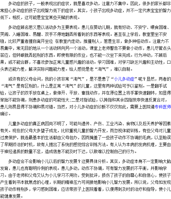 所以說(shuō),及時(shí)寶寶患有多動(dòng)癥,千萬(wàn)不要隨意的給寶寶用藥。如果懷疑寶寶智力低下,也應(yīng)該盡早的到醫(yī)院進(jìn)行檢查和治療。只有這樣,才能在醫(yī)生的合理建議下面進(jìn)行治療,才不會(huì)耽誤了自己的最好的治療時(shí)間。以上就是“孩子多動(dòng)會(huì)不會(huì)發(fā)展成智力低下?”的內(nèi)容了,相信大家在看完文章后已經(jīng)有所認(rèn)識(shí),如果懷疑寶寶智力低下,要盡早的到醫(yī)院進(jìn)行檢查和治療。希望家長(zhǎng),一定要多關(guān)注孩子的健康成長(zhǎng)。