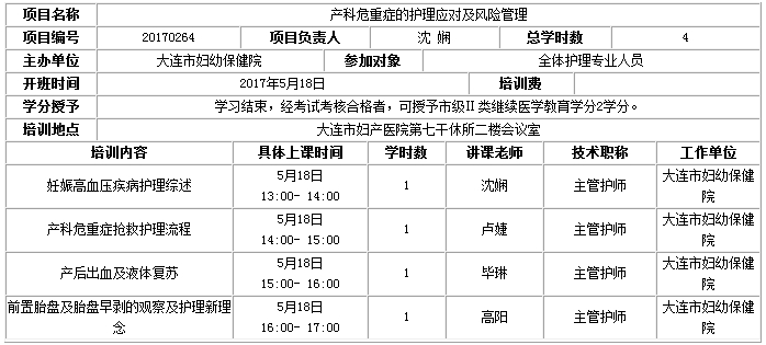 根據(jù)《關(guān)于公布2017年大連市繼續(xù)醫(yī)學教育項目的通知》(大繼委發(fā)〔2017〕3號)精神,《產(chǎn)科危重癥的護理應(yīng)對及風險管理》學習班擬于2017年5月18日開班。具體安排如下: