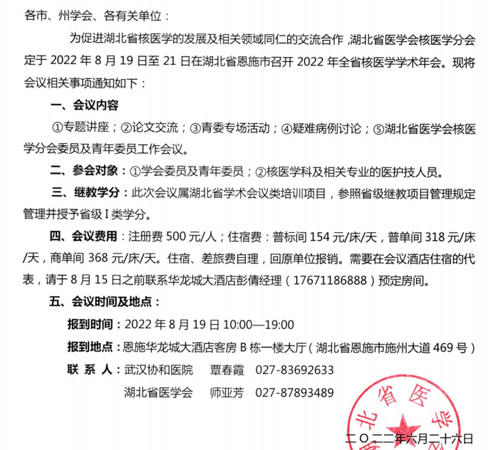 以上就是小編為大家整理的關于召開湖北省醫(yī)學會核醫(yī)學分會2022年學術年會的通知,想了解更多有關繼續(xù)醫(yī)學教育、考試培訓等相關優(yōu)質(zhì)資訊還請多多關注醫(yī)學教育網(wǎng)!
