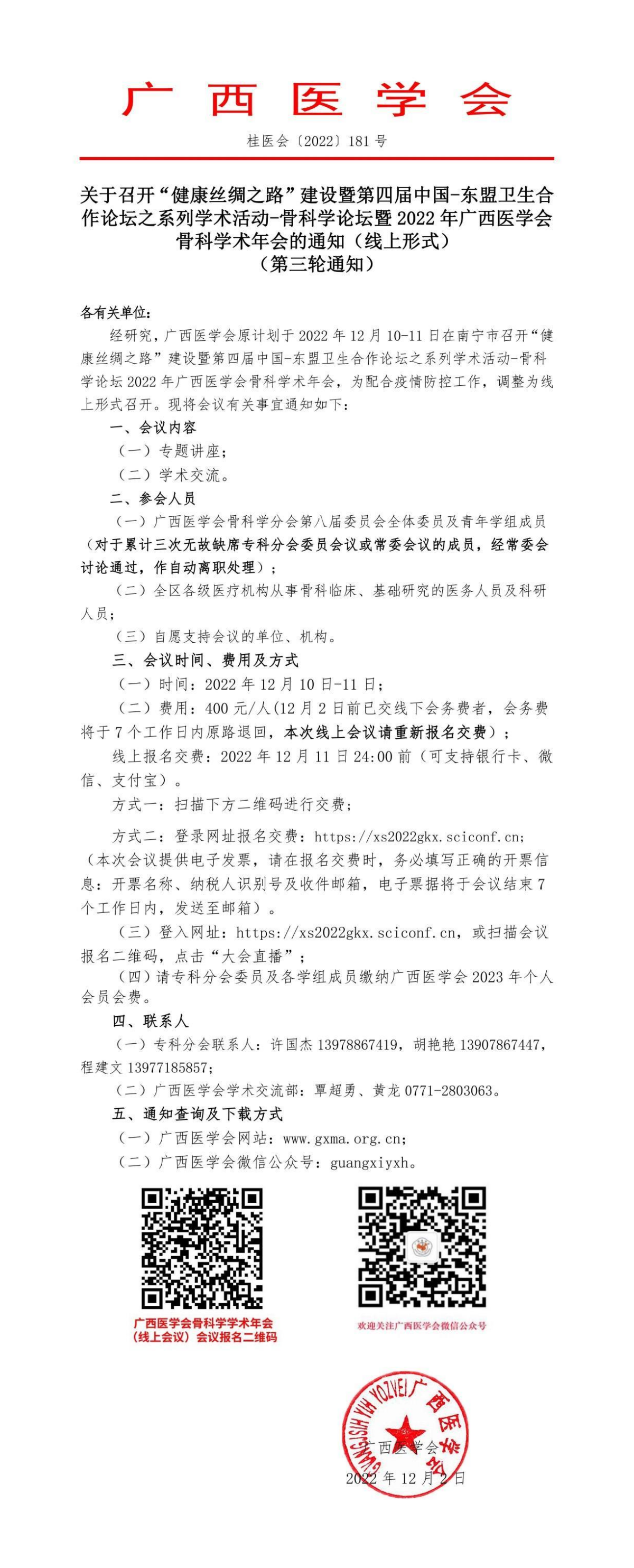 以上就是小編為大家整理的關(guān)于召開“健康絲綢之路”建設(shè)暨第四屆中國-東盟衛(wèi)生合作論壇之系列學(xué)術(shù)活動-骨科學(xué)論壇暨2022年廣西醫(yī)學(xué)會骨科學(xué)術(shù)年會的通知(線上形式)(第三輪通知),想了解更多有關(guān)繼續(xù)醫(yī)學(xué)教育、考試培訓(xùn)等相關(guān)優(yōu)質(zhì)資訊還請多多關(guān)注醫(yī)學(xué)教育網(wǎng)!