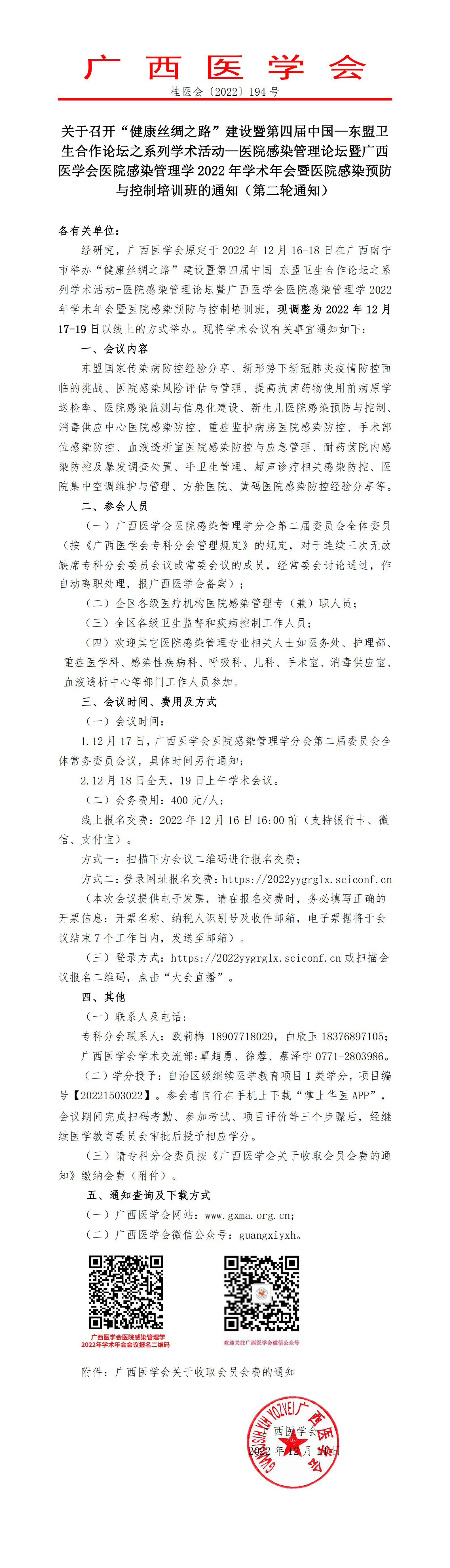 以上就是小編為大家整理的關(guān)于召開“健康絲綢之路”建設(shè)暨第四屆中國—東盟衛(wèi)生合作論壇之系列學(xué)術(shù)活動—醫(yī)院感染管理論壇暨廣西醫(yī)學(xué)會醫(yī)院感染管理學(xué)2022年學(xué)術(shù)年會暨醫(yī)院感染預(yù)防與控制培訓(xùn)班的通知(第二輪通知),想了解更多有關(guān)繼續(xù)醫(yī)學(xué)教育、考試培訓(xùn)等相關(guān)優(yōu)質(zhì)資訊還請多多關(guān)注醫(yī)學(xué)教育網(wǎng)!