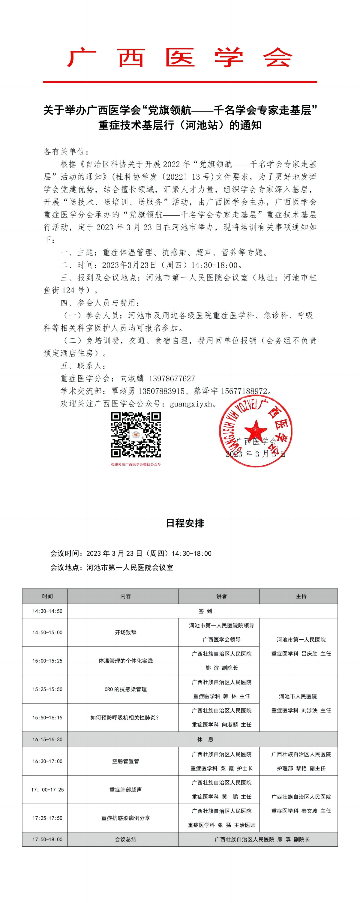 以上就是小編為大家整理的關于舉辦廣西醫(yī)學會“黨旗領航——千名學會專家走基層” 重癥技術基層行(河池站)的通知,想了解更多有關繼續(xù)醫(yī)學教育、考試培訓等相關優(yōu)質資訊還請多多關注醫(yī)學教育網!
