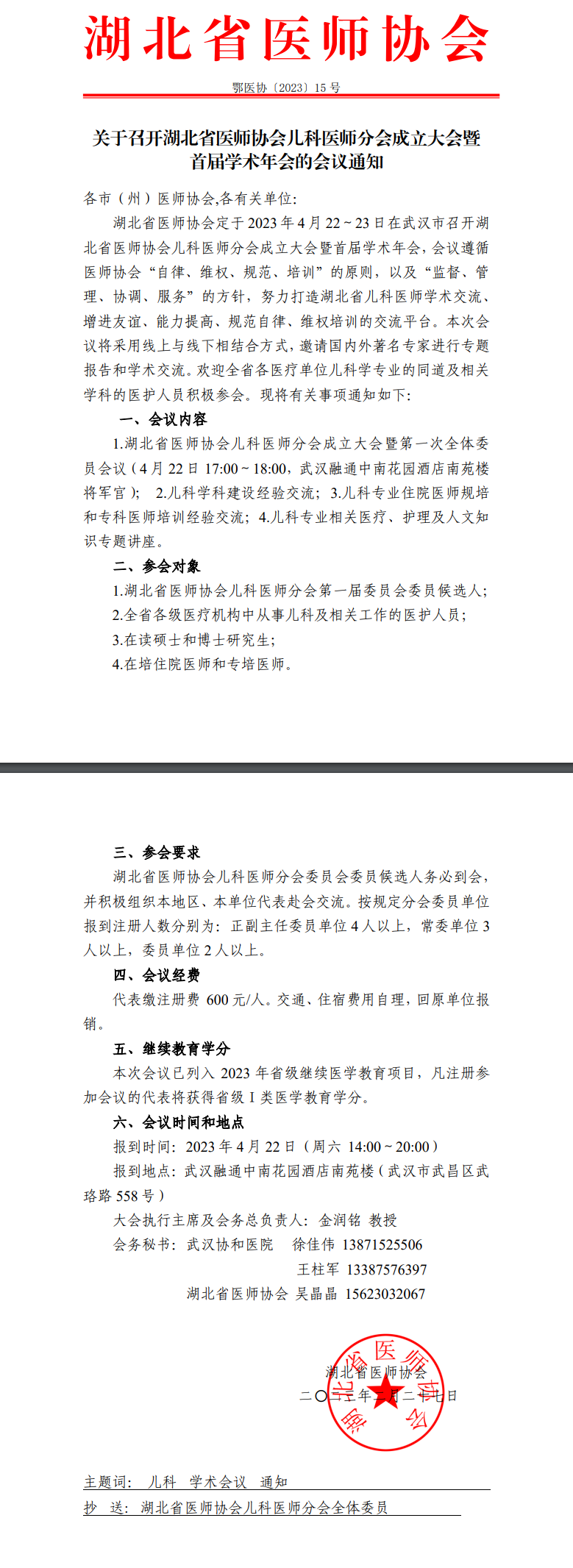 以上就是小編為大家整理的關于召開湖北省醫(yī)師協(xié)會兒科醫(yī)師分會成立大會暨首屆學術年會的會議通知,想了解更多有關繼續(xù)醫(yī)學教育、考試培訓等相關優(yōu)質資訊還請多多關注醫(yī)學教育網(wǎng)!