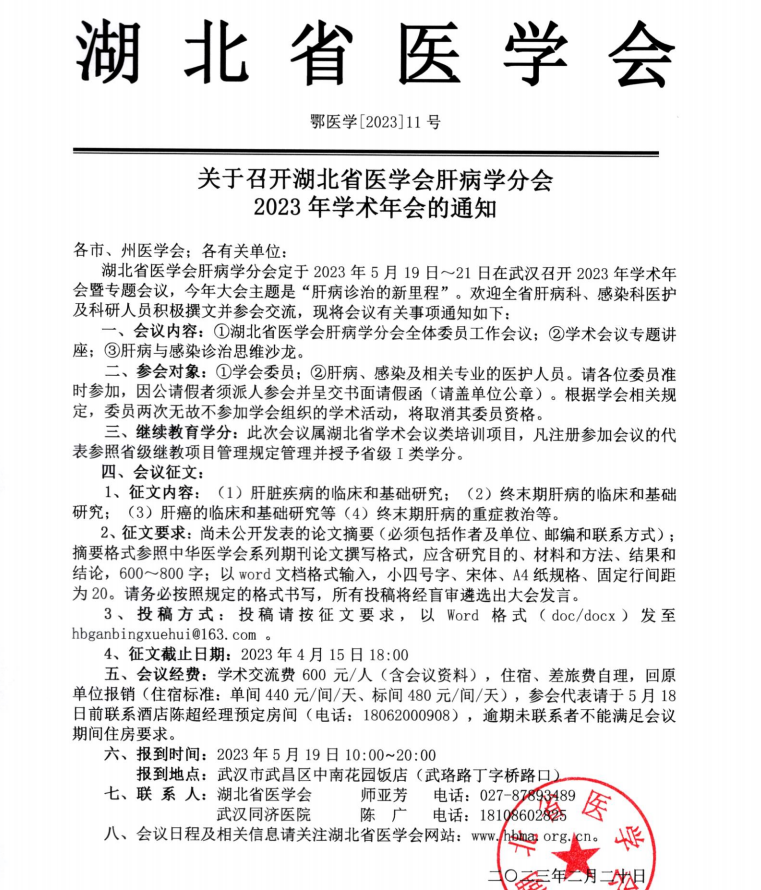 以上就是小編為大家整理的關于召開湖北省醫(yī)學會肝病學分會2023年學術年會的通知,想了解更多有關繼續(xù)醫(yī)學教育、考試培訓等相關優(yōu)質資訊還請多多關注醫(yī)學教育網(wǎng)!