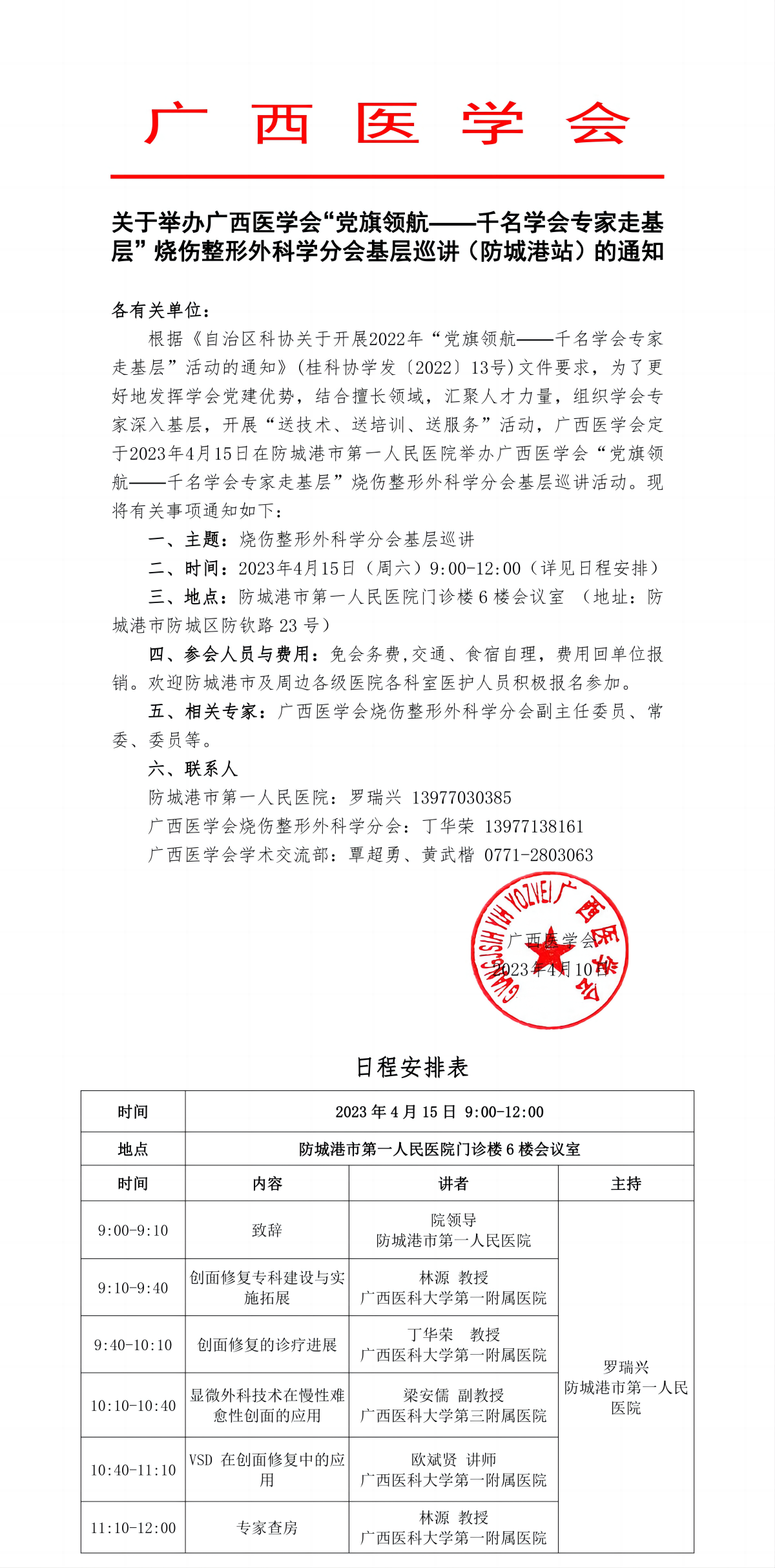 以上就是小編為大家整理的關于舉辦廣西醫(yī)學會“黨旗領航——千名學會專家走基層”燒傷整形外科學分會基層巡講(防城港站)的通知,想了解更多有關繼續(xù)醫(yī)學教育、考試培訓等相關優(yōu)質(zhì)資訊還請多多關注醫(yī)學教育網(wǎng)!