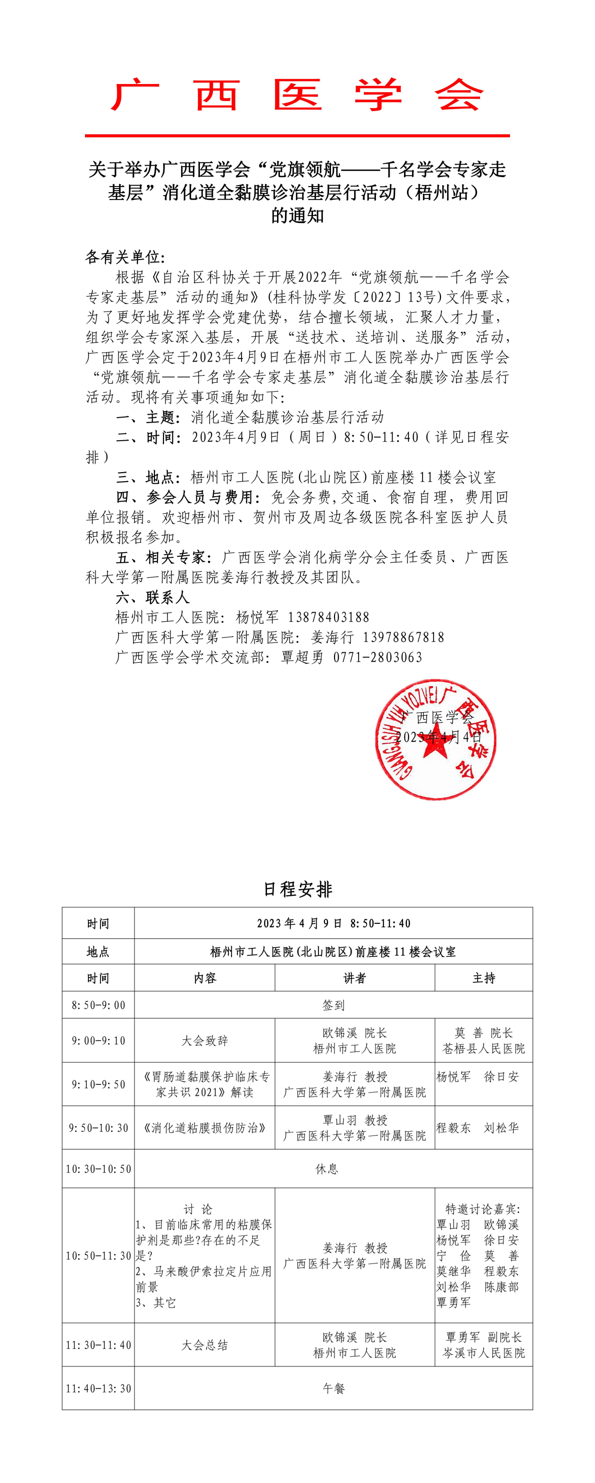 以上就是小編為大家整理的關(guān)于舉辦廣西醫(yī)學(xué)會“黨旗領(lǐng)航——千名學(xué)會專家走基層”消化道全黏膜診治基層行活動(梧州站)的通知,想了解更多有關(guān)繼續(xù)醫(yī)學(xué)教育、考試培訓(xùn)等相關(guān)優(yōu)質(zhì)資訊還請多多關(guān)注醫(yī)學(xué)教育網(wǎng)!