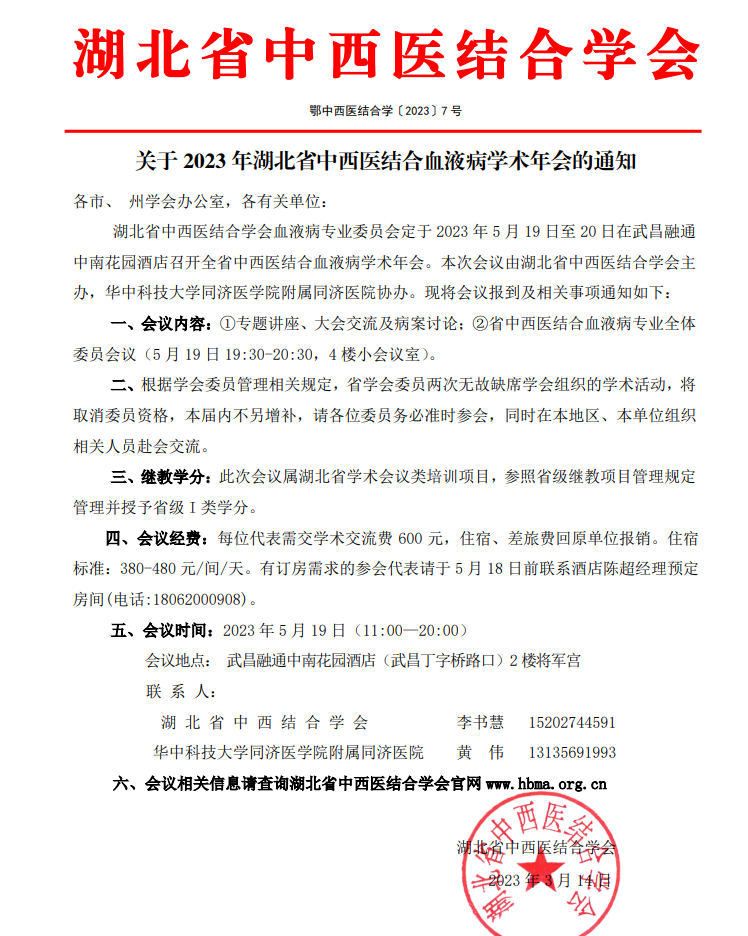 日前,湖北省醫(yī)學(xué)會(huì)發(fā)布了關(guān)于2023年湖北省中西醫(yī)結(jié)合血液病學(xué)術(shù)年會(huì)的通知,為方便大家了解,醫(yī)學(xué)教育網(wǎng)小編特意收集整理了如下內(nèi)容,歡迎查看!