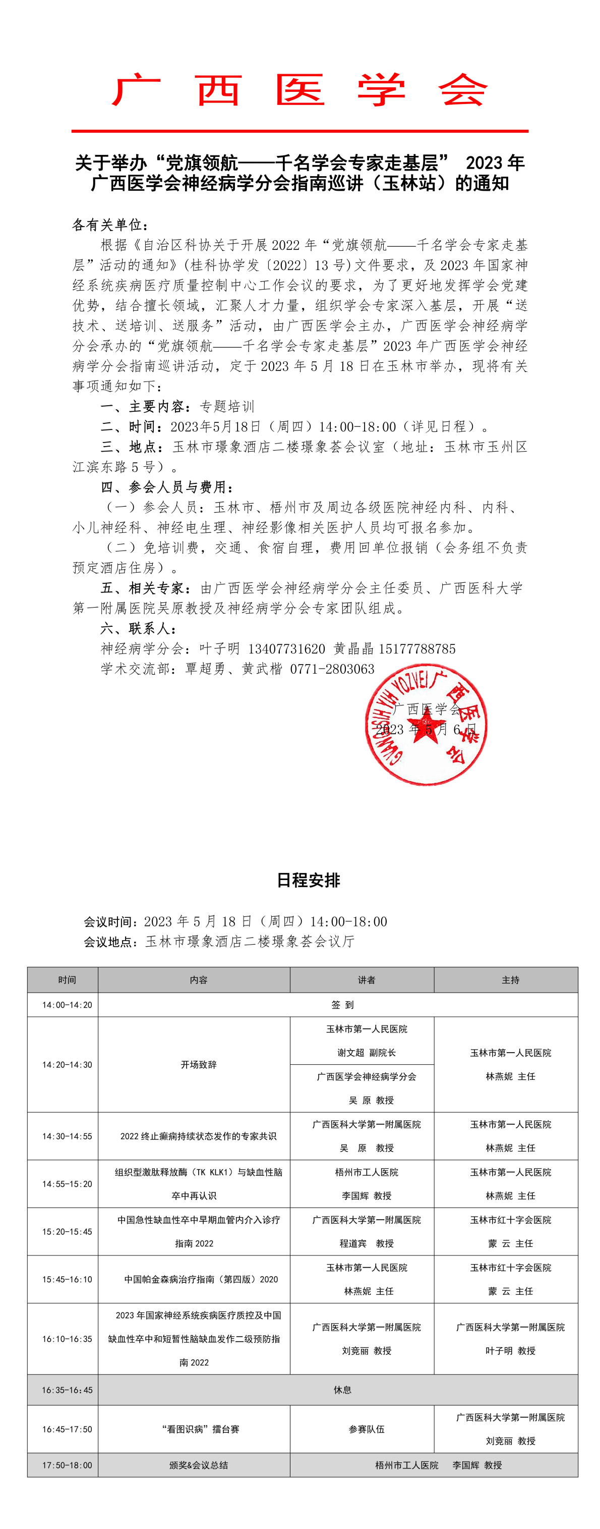 以上就是小編為大家整理的關(guān)于舉辦“黨旗領(lǐng)航——千名學(xué)會(huì)專家走基層” 2023年廣西醫(yī)學(xué)會(huì)神經(jīng)病學(xué)分會(huì)指南巡講(玉林站)的通知,想了解更多有關(guān)繼續(xù)醫(yī)學(xué)教育、考試培訓(xùn)等相關(guān)優(yōu)質(zhì)資訊還請(qǐng)多多關(guān)注醫(yī)學(xué)教育網(wǎng)!
