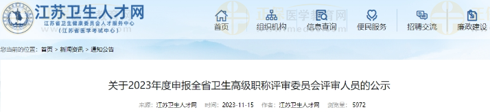 根據(jù)《關(guān)于做好2023年度職稱評審工作的通知》(蘇職稱辦〔2023〕45號)要求,現(xiàn)在評審前對申報2023年省衛(wèi)生、護(hù)理高級職稱評審委員會評審人員名單進(jìn)行公示。公示時間為2023年11月15日至2023年11月21日(5個工作日)。在公示期間內(nèi)可來信向省衛(wèi)生健康委人事處和委人才服務(wù)中心反映情況(南京市中央路42號),來信請署真實姓名。