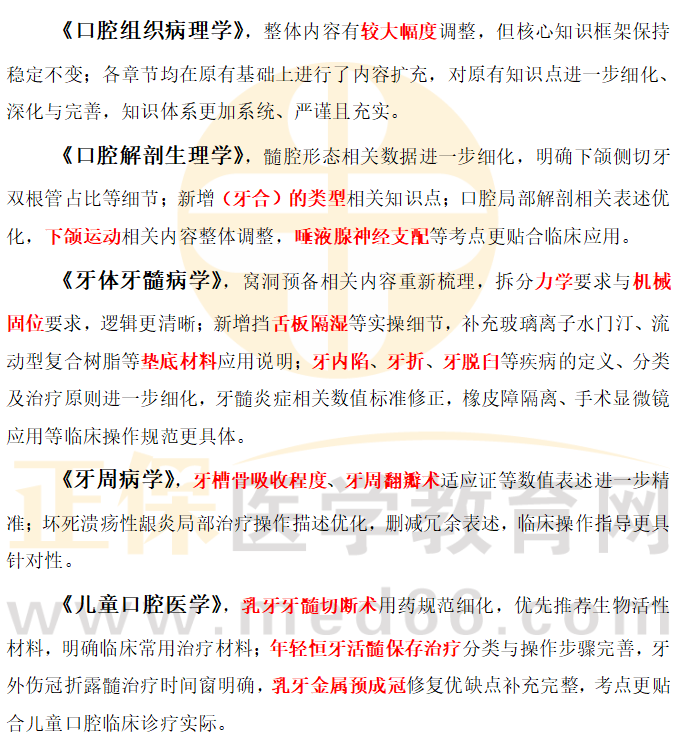 口腔專業(yè)各科目均有不同程度的細(xì)節(jié)調(diào)整,部分科目變動(dòng)較為突出,同時(shí)多個(gè)科目在原有基礎(chǔ)上擴(kuò)充內(nèi)容、細(xì)化考點(diǎn),專業(yè)詞匯描述與臨床操作規(guī)范更貼合實(shí)際。
