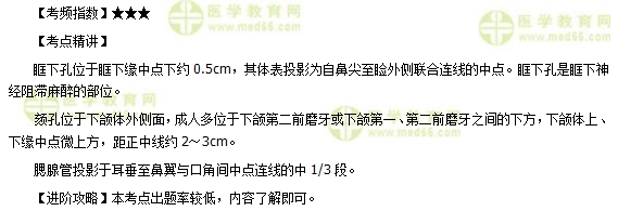 本考點(diǎn)出題率較低,內(nèi)容了解即可。有關(guān)知識(shí)點(diǎn)整理為“口腔執(zhí)業(yè)醫(yī)師考點(diǎn)梳理-面部表面解剖”,如下: