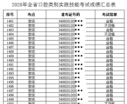 安慶市2020年口腔執(zhí)業(yè)醫(yī)師技能操作成績(jī)匯總表