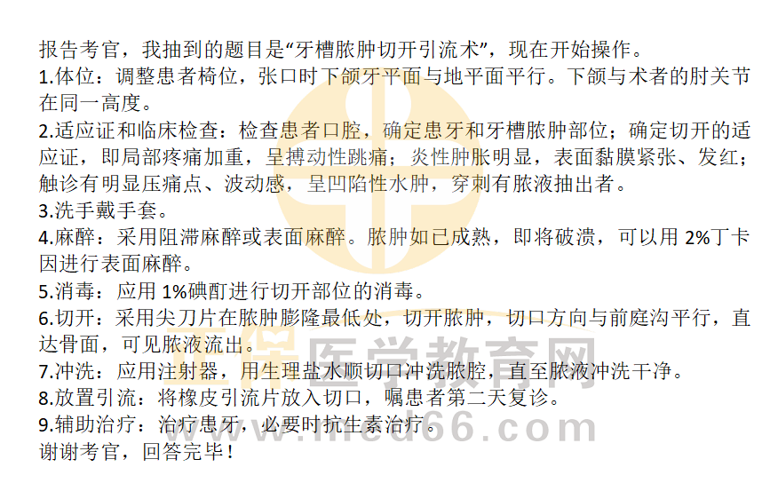 以上分享的“牙槽膿腫切開引流術——2023口腔執(zhí)業(yè)醫(yī)師技能實操口述要領”內容,由醫(yī)學教育網小編搜集整理,如果您覺得對您有所幫助,可以分享給朋友。想了解更多醫(yī)學考試信息、復習資料、備考干貨請關注醫(yī)學教育網。