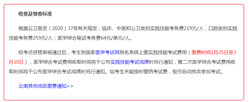 根據(jù)云衛(wèi)醫(yī)發(fā)(2020)37號(hào)有關(guān)規(guī)定,臨床、中醫(yī)和公衛(wèi)類別實(shí)踐技能考務(wù)費(fèi)219元/人,口腔類別實(shí)踐技能考務(wù)費(fèi)259元/人;醫(yī)學(xué)綜合筆試考務(wù)費(fèi)64元/單元/人。