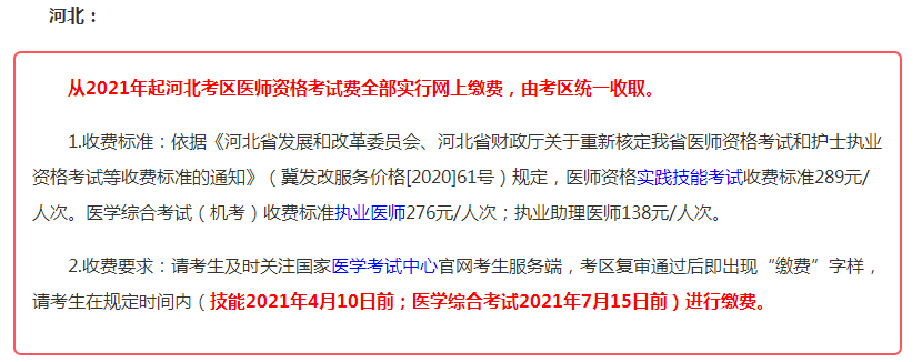 從2021年起河北考區(qū)醫(yī)師資格考試費全部實行網(wǎng)上繳費,由考區(qū)統(tǒng)一收取。