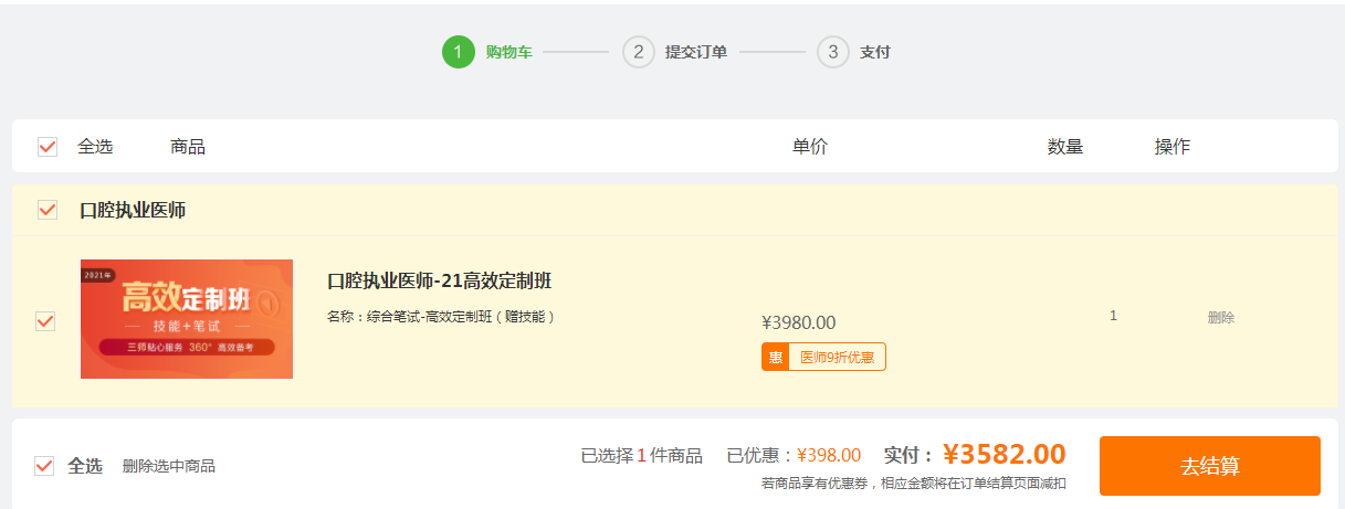 第二步:選擇你想要購買的課程,2021年口腔執(zhí)業(yè)醫(yī)師考試輔導開設高效定制班、無憂實驗班、超值精品班、技能特色班4大班次,各大班次的區(qū)別>>