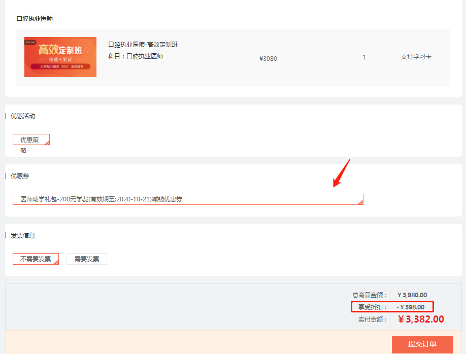 第三步:點擊立即購買提交訂單即可,最終的價格為原價的9折-學費紅包的價格,以高效定制班為例,最終的到手價為3382元,相當于節(jié)省了598元。課程購買后即可登錄我的網校我的家學習啦,2021年課程贈送2020年輔導。
