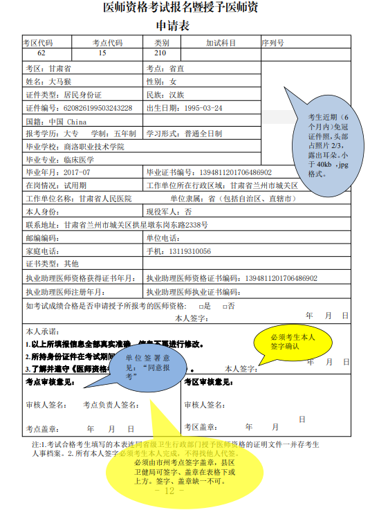 2022年醫(yī)師資格考試報名審核相關(guān)材料填寫范例及填寫說明