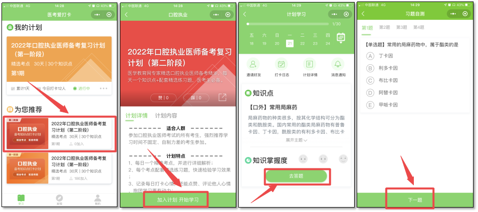 第三步:選擇備考科目后即進入學習計劃選擇的頁面,請選擇“您的備考計劃”,如口腔執(zhí)業(yè)醫(yī)師備考復習計劃(第二階段),然后點擊下方“加入計劃 開始學習”按鈕,開始正式進入打卡學習。