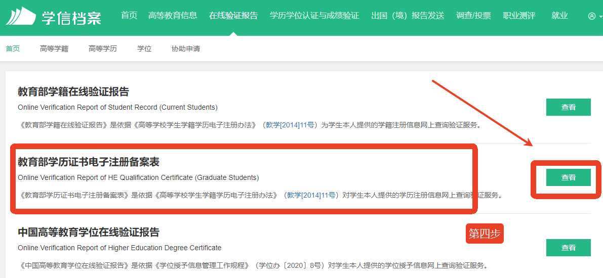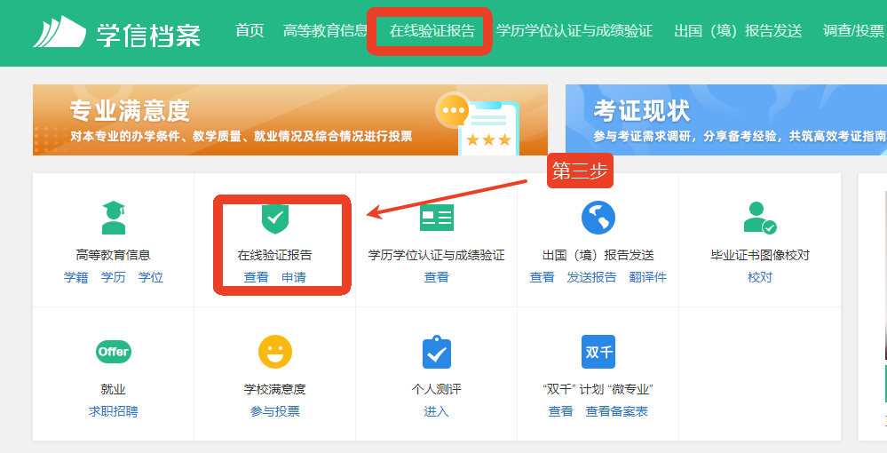 3、登錄后點(diǎn)擊頂部菜單或下方中的“在線驗(yàn)證報(bào)告”欄目,可申請(qǐng)《教育部學(xué)歷證書電子注冊(cè)備案表》。