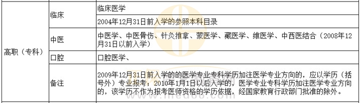 4.2009年12月31日前入學(xué)的,符合本款規(guī)定的醫(yī)學(xué)專業(yè)專科學(xué)歷加注醫(yī)學(xué)專業(yè)方向的,應(yīng)以學(xué)歷專業(yè)報(bào)考;2010年1月1日以后入學(xué)的,醫(yī)學(xué)專業(yè)專科學(xué)歷加注醫(yī)學(xué)專業(yè)方向的,該學(xué)歷不作為報(bào)考醫(yī)師資格的學(xué)歷依據(jù),經(jīng)國家教育行政部門批準(zhǔn)的除外。