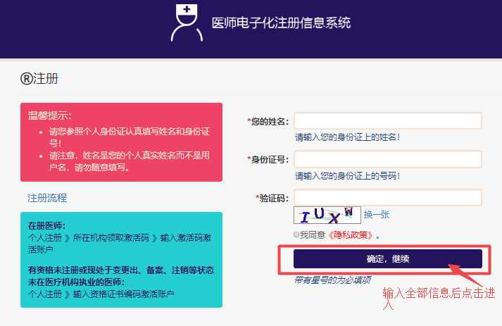 3.填寫注冊信息,輸入“您的姓名”和“身份證號”,填寫正確的“驗證碼”后,點擊【確定,繼續(xù)】。(*請您參照個人身份證認真填寫姓名和身份證號!請注意,姓名是您的個人真實姓名而不是用戶名,請勿隨意填寫)