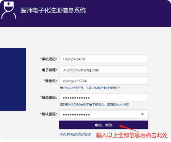 4.填寫“手機號”、“電子郵箱”、“登錄名”,正確設置“登錄密碼”和“確認密碼”后,點擊【確定,繼續(xù)】。(注意:帶有星號*的為必填項)