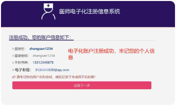 5.電子化賬戶注冊成功,點擊【點擊下一步】按鈕即可進行登錄。(請牢記您的用戶名和密碼,建議記錄下來或手機拍照)