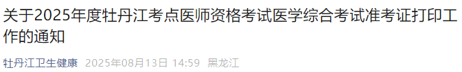 黑龍江牡丹江2025年醫(yī)師資格綜合筆試準(zhǔn)考證8月14日起打??!以下為牡丹江考點(diǎn)官方發(fā)布的考前提醒,請(qǐng)相關(guān)考生及時(shí)查看,做好應(yīng)試準(zhǔn)備!