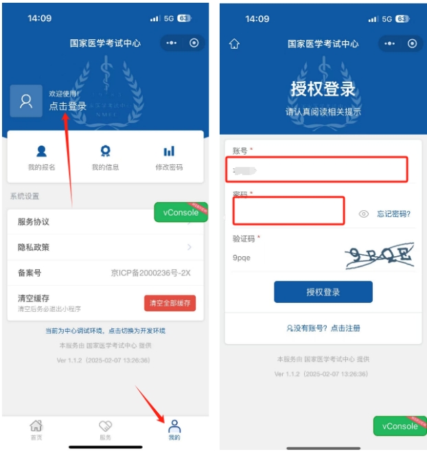 第二步:使用考生服務(wù)系統(tǒng)的注冊(cè)帳號(hào)和密碼進(jìn)行小程序授權(quán)登陸(已完成考生服務(wù)系統(tǒng)與微信綁定的可直接登陸微信小程序),如下圖演示: