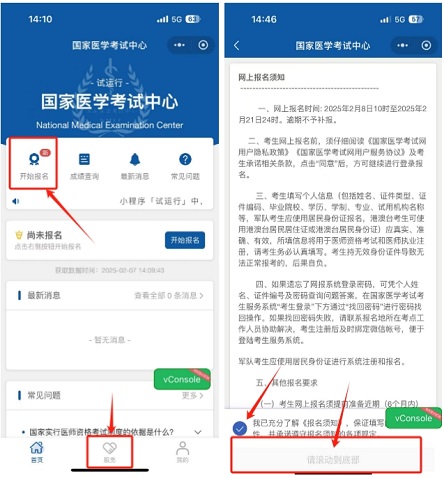 第一步:登陸成功之后可點(diǎn)擊“開(kāi)始報(bào)名”或者直接點(diǎn)擊下方菜單中的“服務(wù)”, 閱讀報(bào)名須知并勾選后方可進(jìn)行下一步報(bào)名。