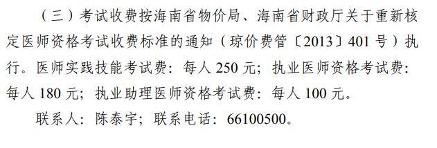 考試收費(fèi)按海南省物價(jià)局、海南省財(cái)政廳關(guān)于重新核定醫(yī)師資格考試收費(fèi)標(biāo)準(zhǔn)的通知(瓊價(jià)費(fèi)管〔2013〕401 號(hào))執(zhí)行。醫(yī)師實(shí)踐技能考試費(fèi):每人 250 元;執(zhí)業(yè)醫(yī)師資格考試費(fèi):每人 180 元;執(zhí)業(yè)助理醫(yī)師資格考試費(fèi):每人 100 元。