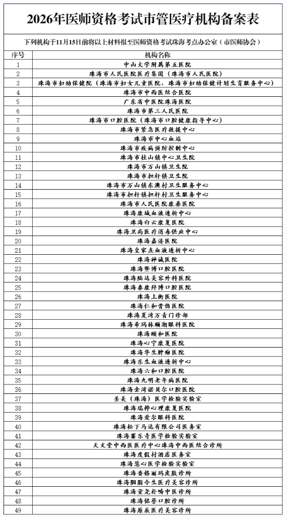 根據(jù)醫(yī)師資格考試廣東省考區(qū)辦公室《關(guān)于做好2026年醫(yī)師資格考試備案工作的通知》(粵醫(yī)考辦〔2025〕32號)文件精神,為做好2026年珠??键c醫(yī)師資格考試備案工作,現(xiàn)將有關(guān)事項通知如下: