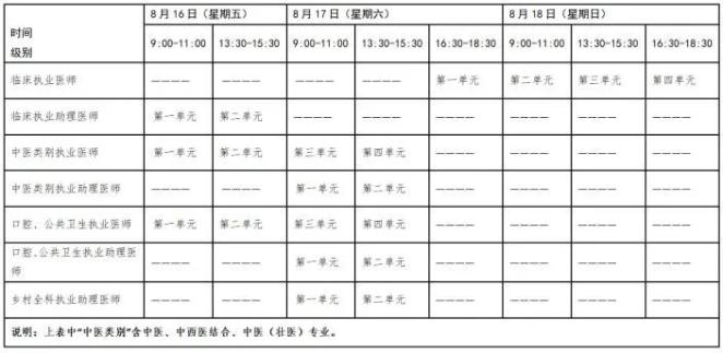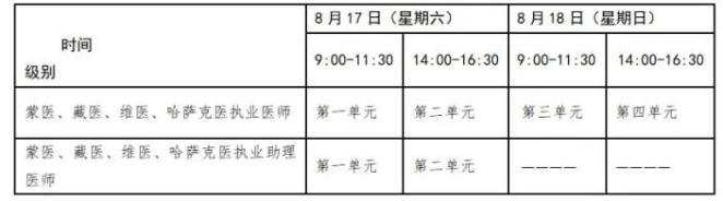 醫(yī)學(xué)綜合考試實(shí)行計(jì)算機(jī)化考試,軍隊(duì)現(xiàn)役人員加試軍事醫(yī)學(xué)、院前急救崗位和兒科專業(yè)加試相應(yīng)內(nèi)容。中醫(yī)類別蒙醫(yī)、藏醫(yī)、維醫(yī)、哈薩克醫(yī)專業(yè)實(shí)行紙筆考試。統(tǒng)一考試時(shí)間如下: