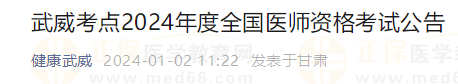 甘肅武威考點(diǎn)2024年度醫(yī)師資格考試公告已發(fā)布,網(wǎng)上報(bào)名時(shí)間自2024年1月22日至2024年2月4日24時(shí),現(xiàn)場審核時(shí)間及具體現(xiàn)場審核報(bào)名所需材料等事宜,后續(xù)將在武威衛(wèi)生健康委員會(huì)網(wǎng)站公布,醫(yī)學(xué)教育網(wǎng)小編為大家整理如下內(nèi)容: