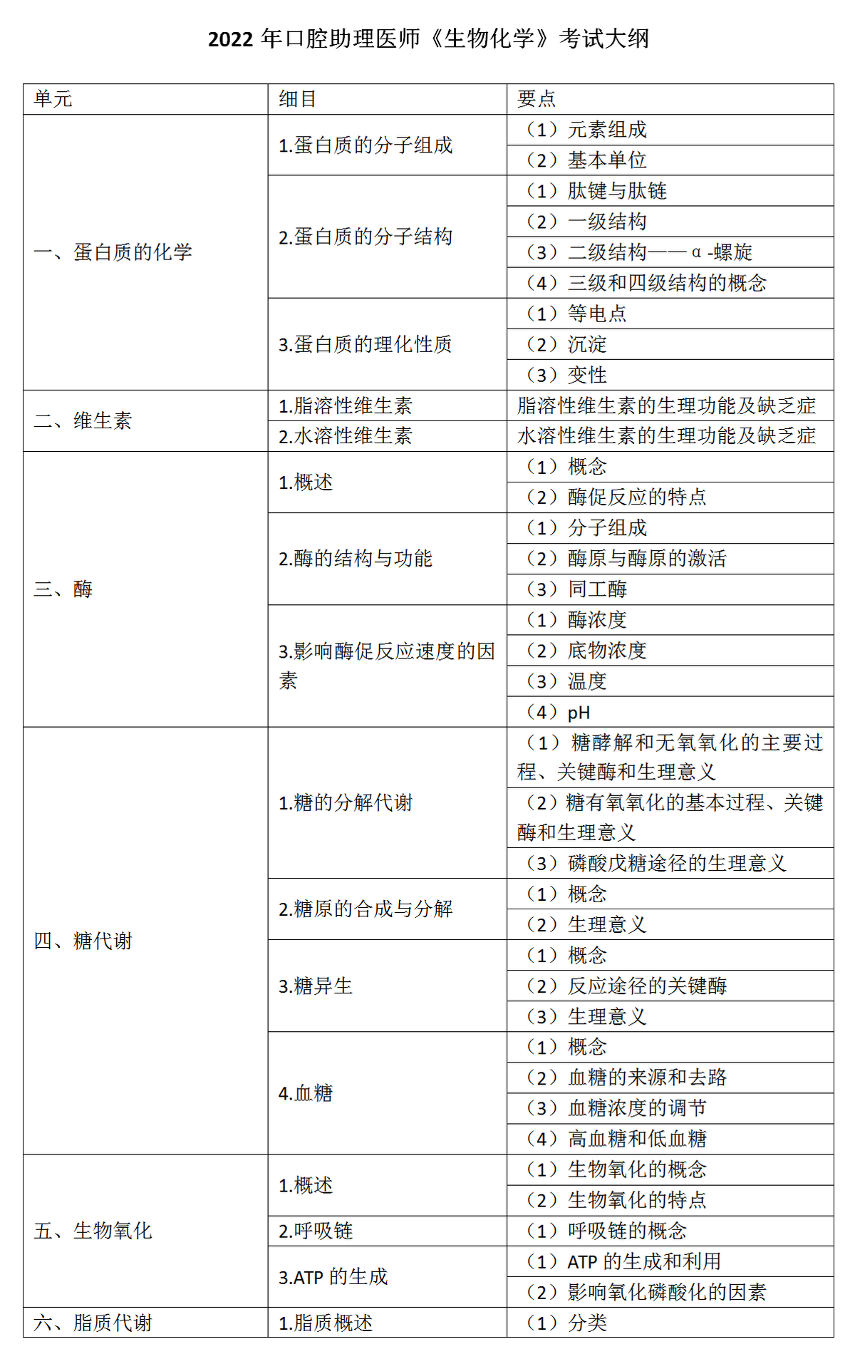 2022年口腔執(zhí)業(yè)助理醫(yī)師《生物化學(xué)》考試大綱