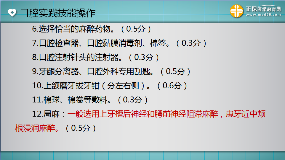 “口腔實(shí)踐技能基本操作技術(shù)答題得分點(diǎn)-上頜第一磨牙拔除術(shù)(20分)”的內(nèi)容,由醫(yī)學(xué)教育網(wǎng)編輯整理,更多口腔助理醫(yī)師考試復(fù)習(xí)資料、考試動(dòng)態(tài)、學(xué)習(xí)經(jīng)驗(yàn)技巧,敬請關(guān)注醫(yī)學(xué)教育網(wǎng)口腔助理醫(yī)師欄目。