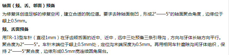 用TR-11型(細(xì)錐形)金剛砂車針打開近遠(yuǎn)中鄰面接觸點(diǎn),并適當(dāng)增加鄰面寬度。改用TR-13型車針預(yù)備,保持2°——5°的軸面聚合度,形成與頰舌向連續(xù)的0.5mm寬圓角齦上肩臺(tái)。