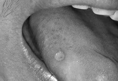 患者,男,32歲,某企業(yè)骨干,已婚。因反復發(fā)生口腔潰爛前來就診。自述口腔反復發(fā)生口腔潰瘍2年余,其部位不斷變化,發(fā)作間隙為2~4周,發(fā)作時疼痛難忍,影響進食,潰瘍8到10天左右愈合。近4天舌部出現(xiàn)潰瘍,疼痛明顯,工作壓力大,晚上休息差??谇粰z查:舌部右側(cè)緣有一直徑約2mm的表淺潰瘍,周邊紅,潰瘍表面覆蓋淡黃色假膜,潰瘍面微凹陷,觸痛明顯??趦?nèi)其他檢查未見異常。病損檢查情況見下圖: