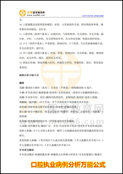 2、病例分析萬能公式:口腔助理醫(yī)師技能考試第五站病例分析,計算機呈現(xiàn)試題,考生口述作答,由考官評分,分值18分。